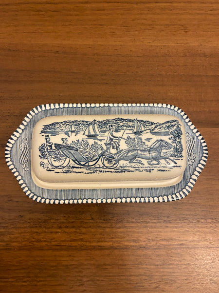 Ceramic Blue Transfer Butter Dish Currier and Ives Horse Ride at the Shore Out of stock