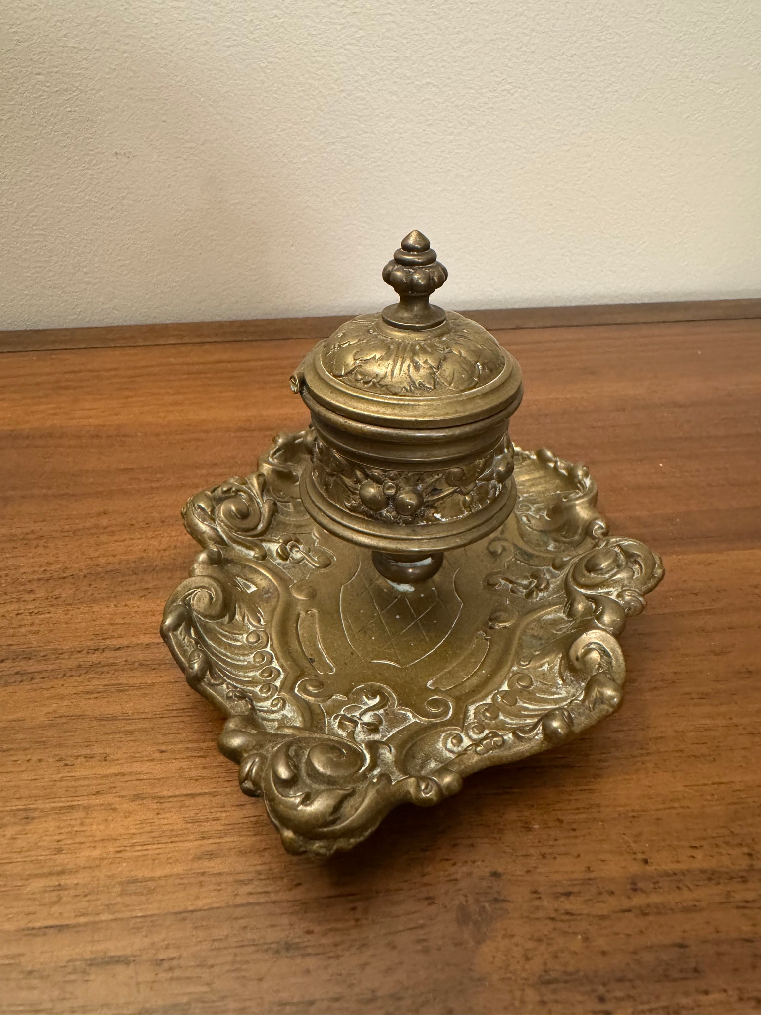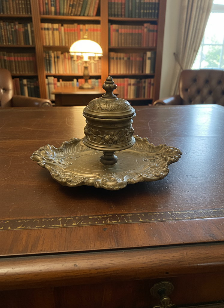 Discover the charm of this exquisite antique inkwell, crafted from solid brass and adorned with beautiful ornate details.