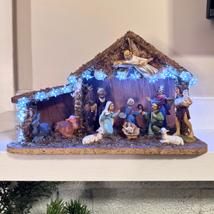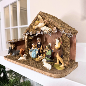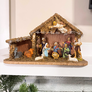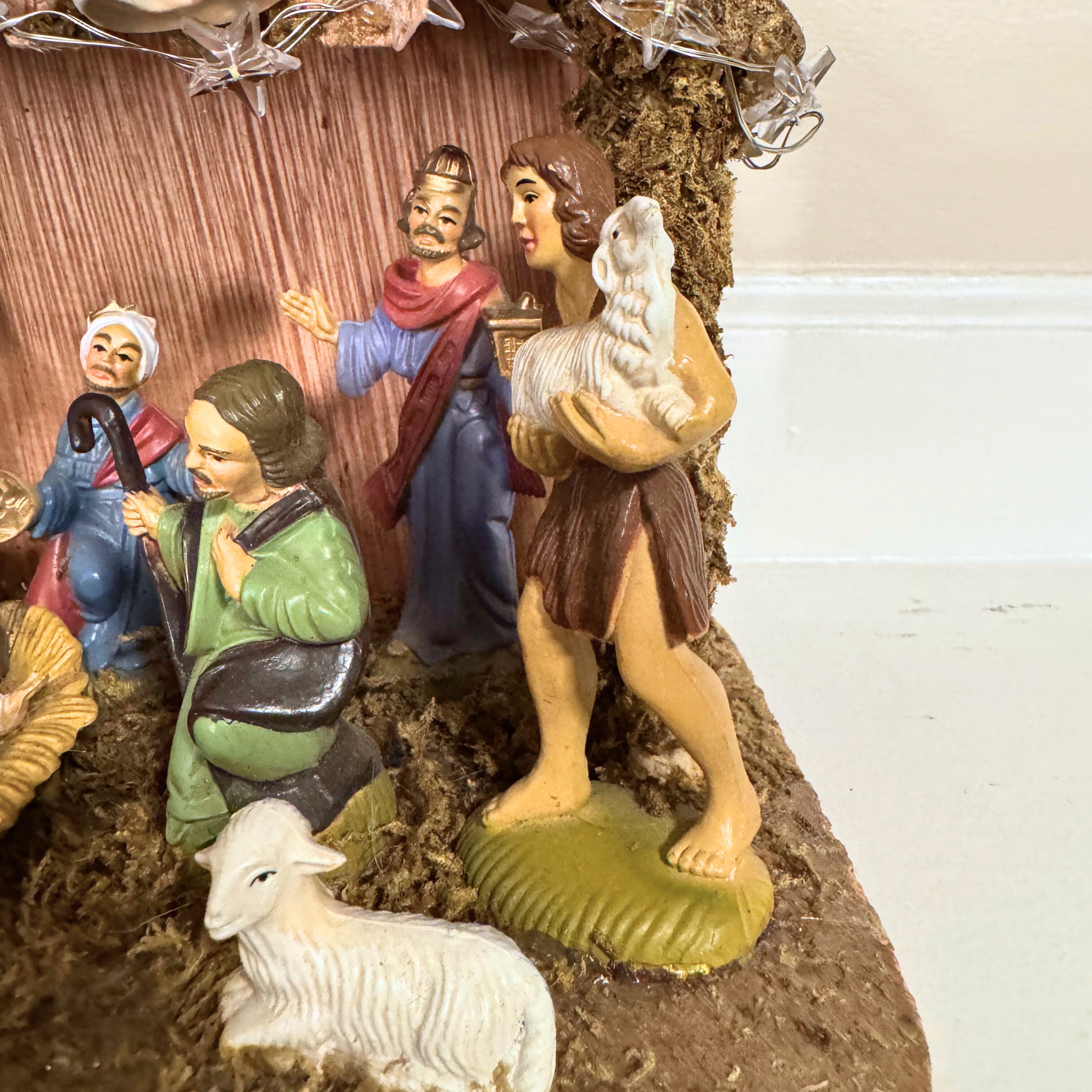 This stunning vintage nativity piece is displayed on sturdy manger stables. While it showcases a design reminiscent of Italian craftsmanship, we have yet to confirm its origins. With exquisite details and soft tonal colors, it is beautifully illuminated by a battery-operated LED string of starlights, adding a holy touch to any setting.