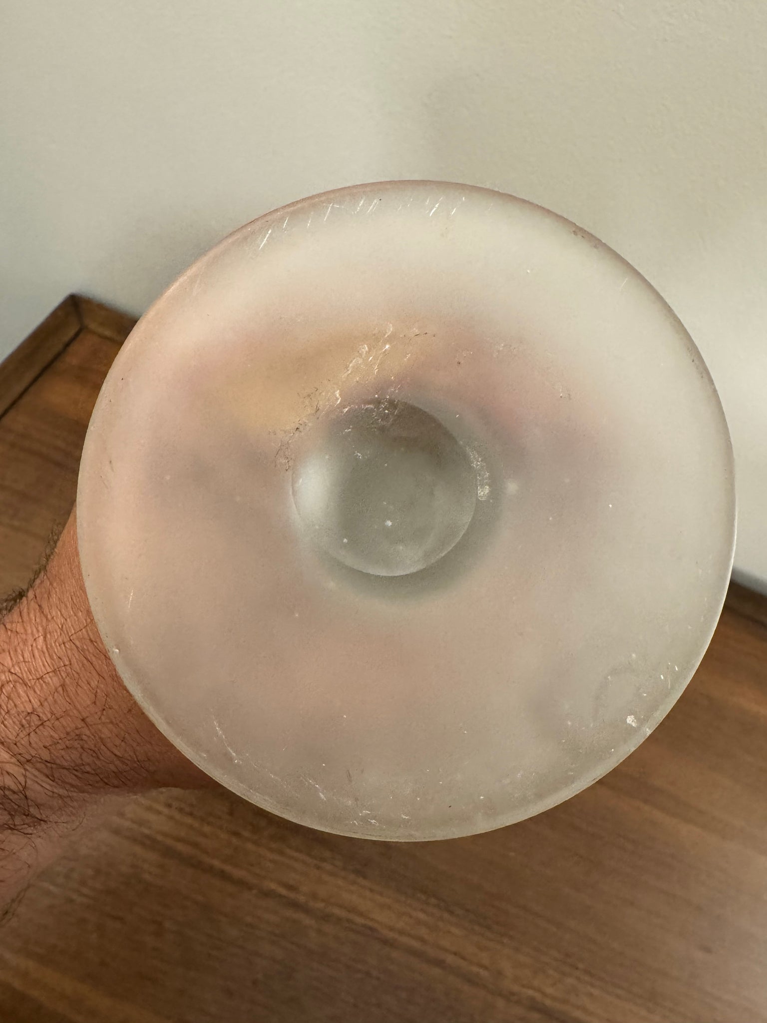 This vintage and rare glass pitcher or vase features a frosted, smooth matte finish, showcasing a blend of Victorian and Art Deco styles. It has a stem and a handle, which appear to have been added during the hot manufacturing process. The bowl body of the piece is definitely molded and finished to be put together by hand. While it is certainly vintage, it may also be considered antique. No similar items have been found on the market. There is a name or signature at the bottom, but it isn't easy to read.