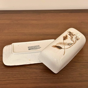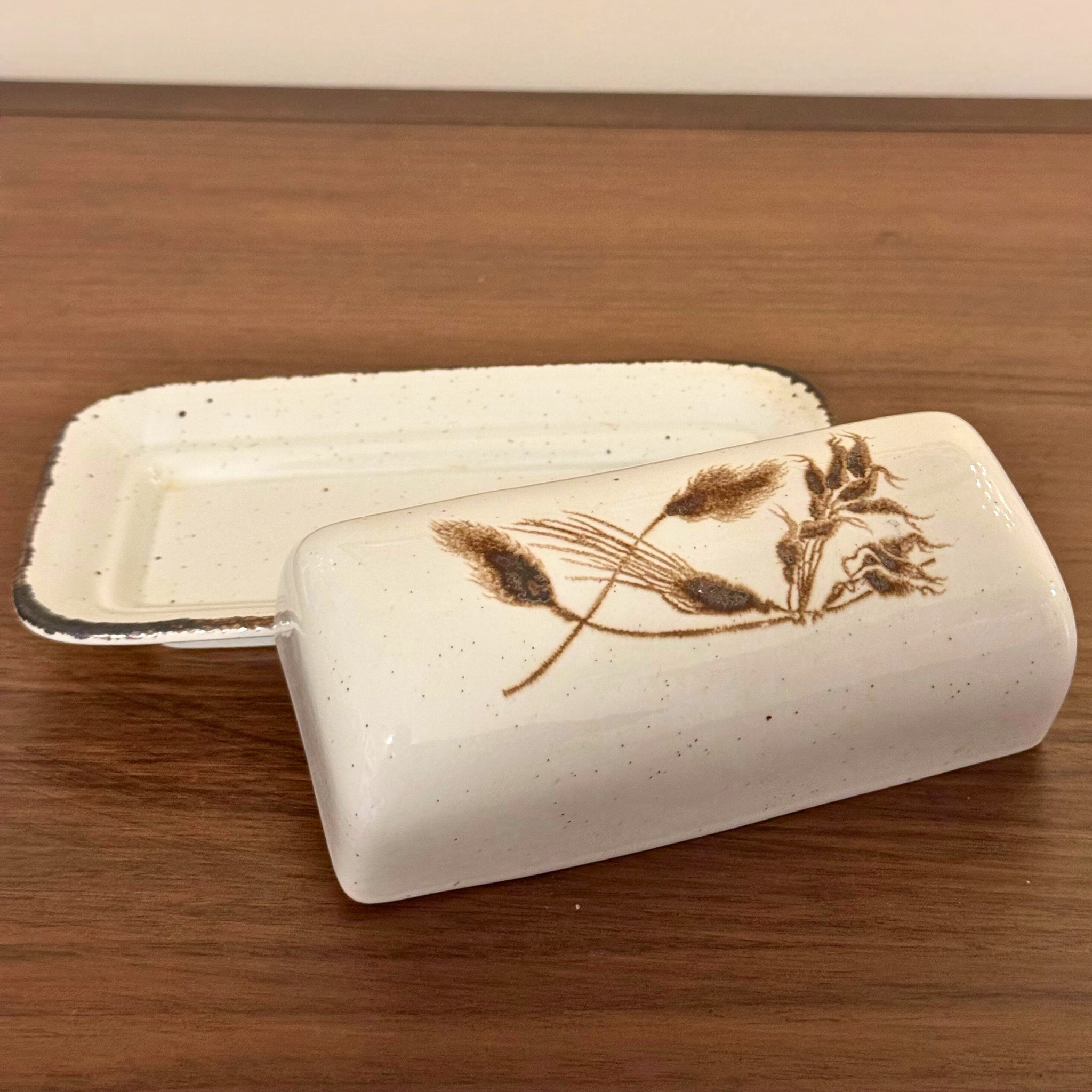 Discover the elegant combination of sophistication and rustic charm with this beautiful butter dish. It features a wild oats design by Stonehenge Midwinter, part of the Wedgwood group. This rustic piece perfectly blends artistry and functionality made in England.