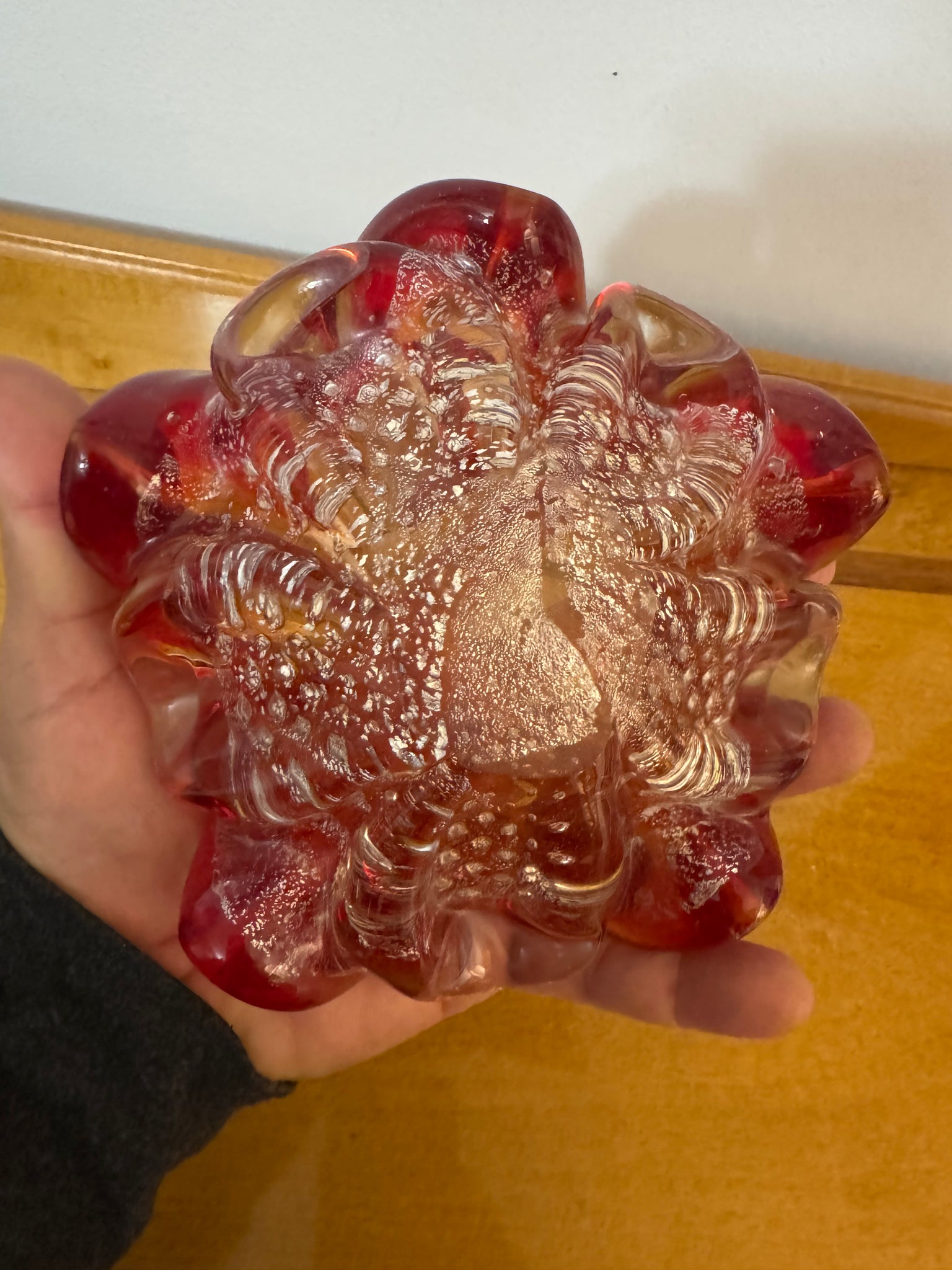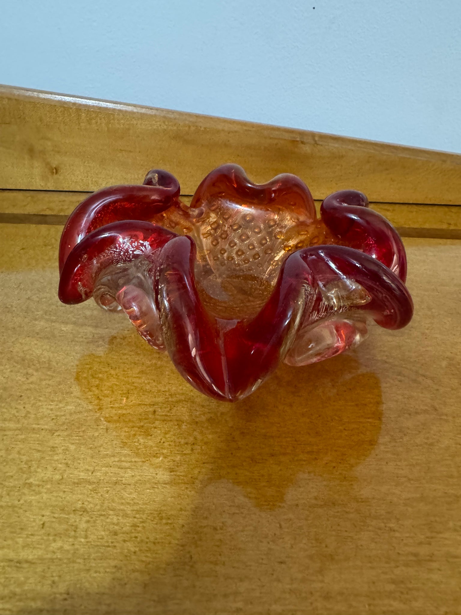 This vintage Italian handblown mid-century modern Murano glass art ashtray features a stunning red color with gold-dust flakes that resemble golden bubbles.