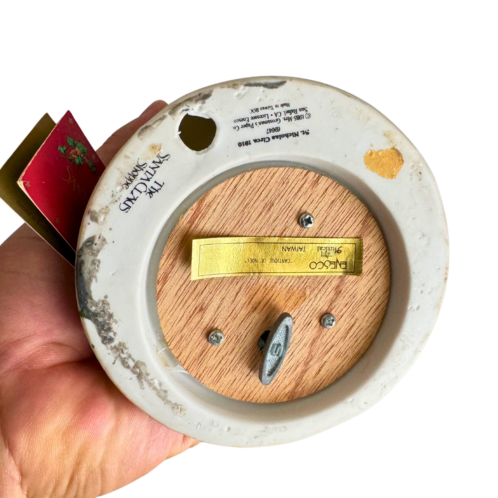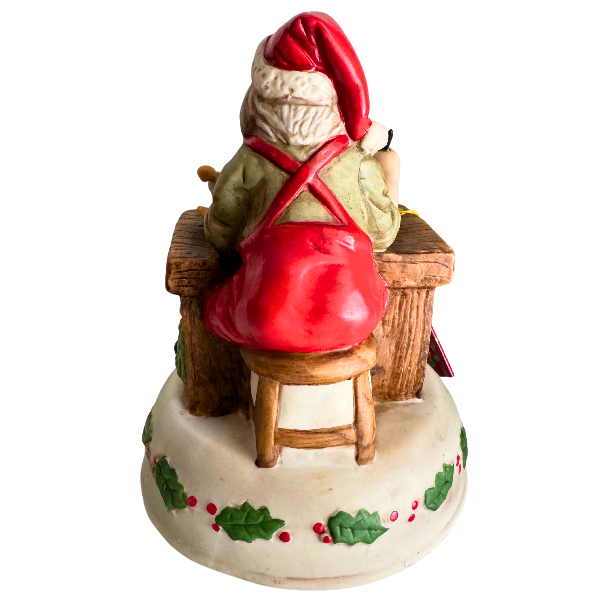 Enhance your holiday ambiance with this vintage Enesco musical box, Santa Claus the Craftsman, which embodies the season's charm. This piece is adorned with a picturesque toy workshop scene; it brings the essence of the holidays to life, adding a touch of timeless elegance to your decor.
