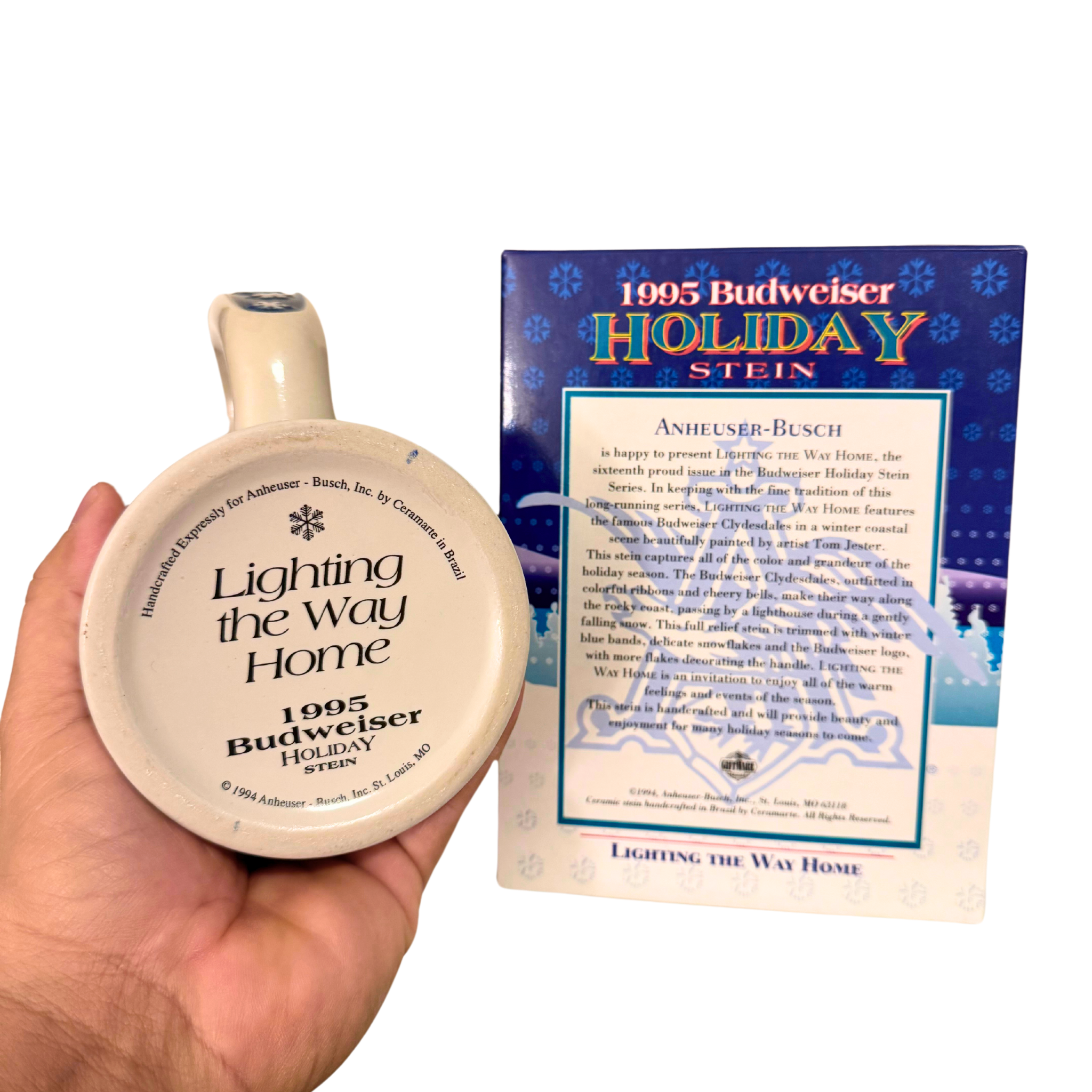 Discover the Budweiser Beer Stein mug from the Holiday Lighting The Way Home Series, crafted in 1995. This collectible piece captures the festive spirit and showcases your holiday cheer. Don't miss the opportunity to elevate your collection with this unique stein!