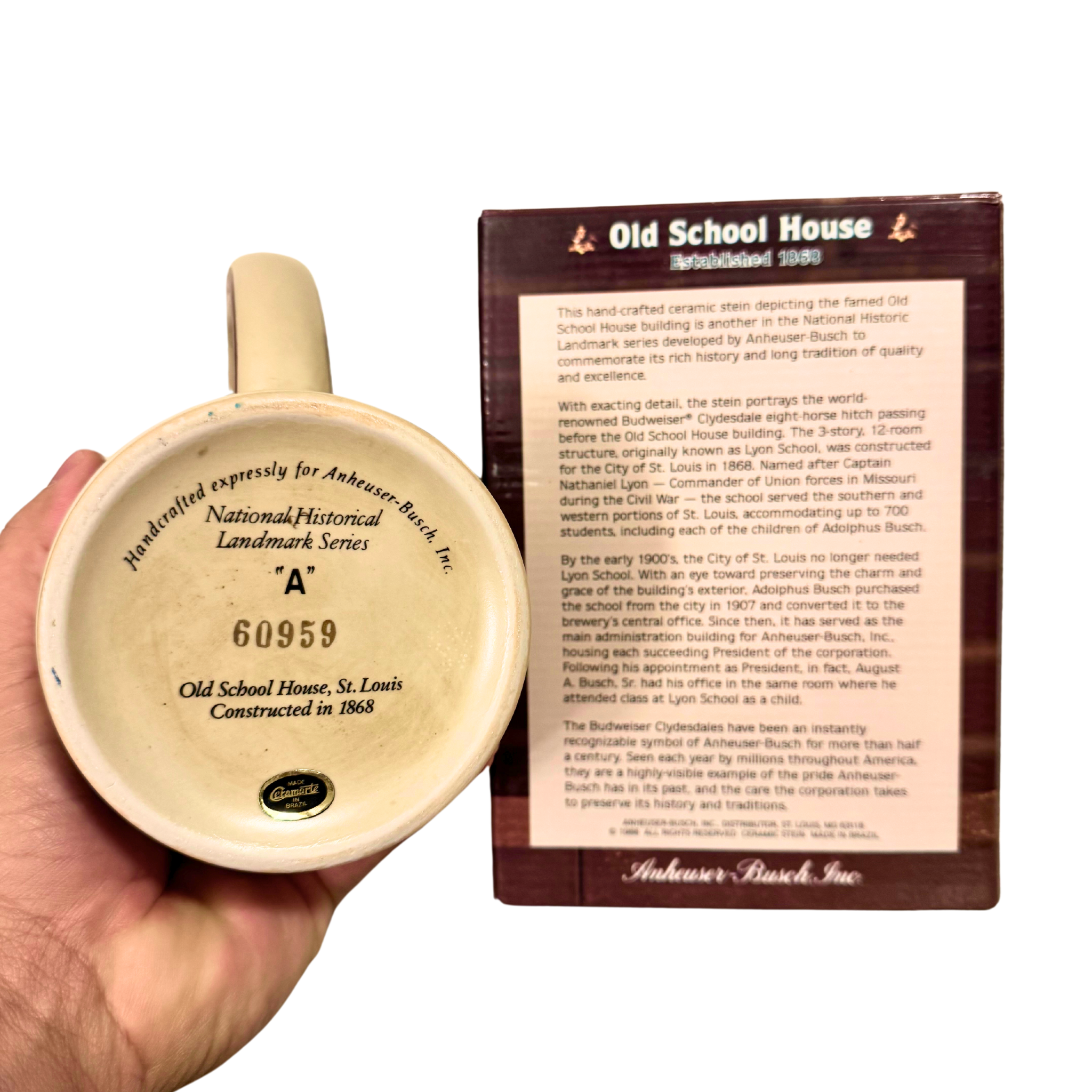 This Budweiser Beer Stein Mug from the National Historical Landmark Series A-60959: Celebrate the charm of the Old School House with this exquisite piece. Perfect for collectors and enthusiasts alike!