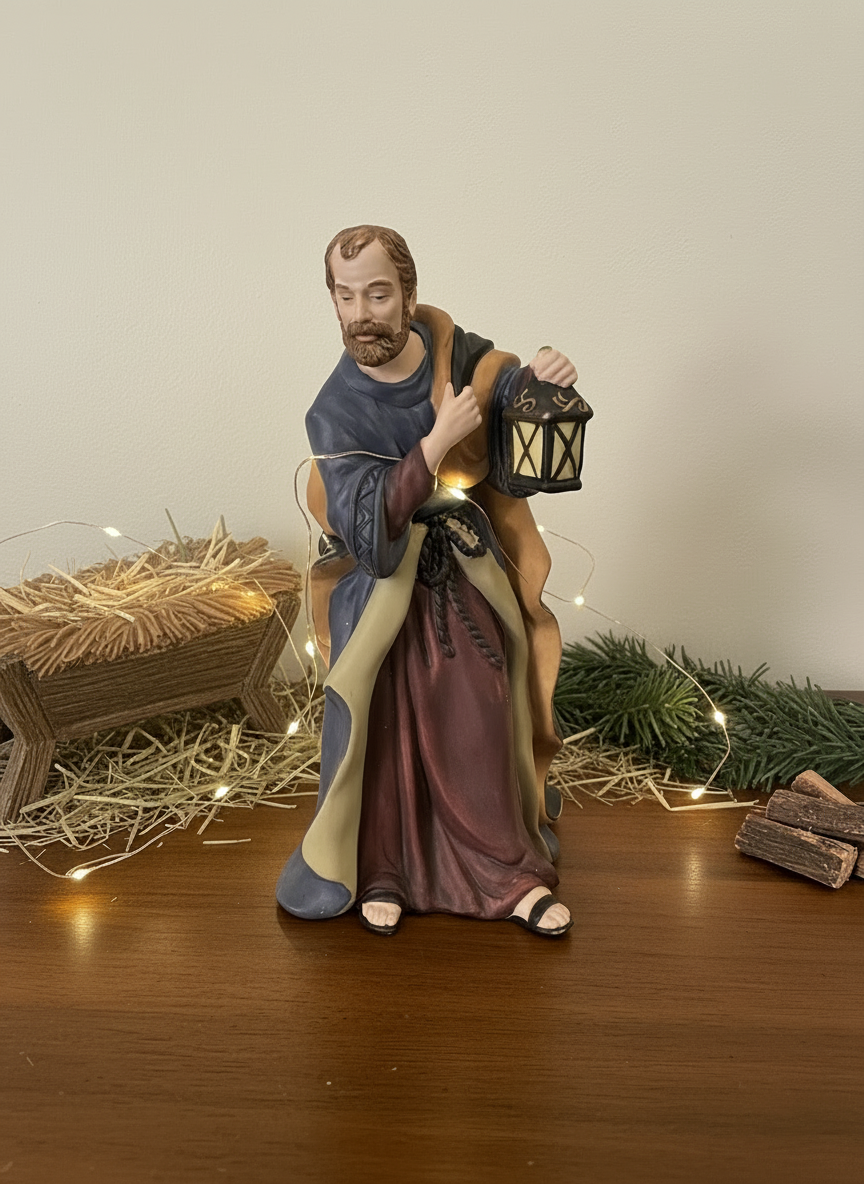 This is a vintage St. Joseph porcelain figure from a Kirkland nativity, perfect for holiday decor or as a replacement for a lost or broken piece.