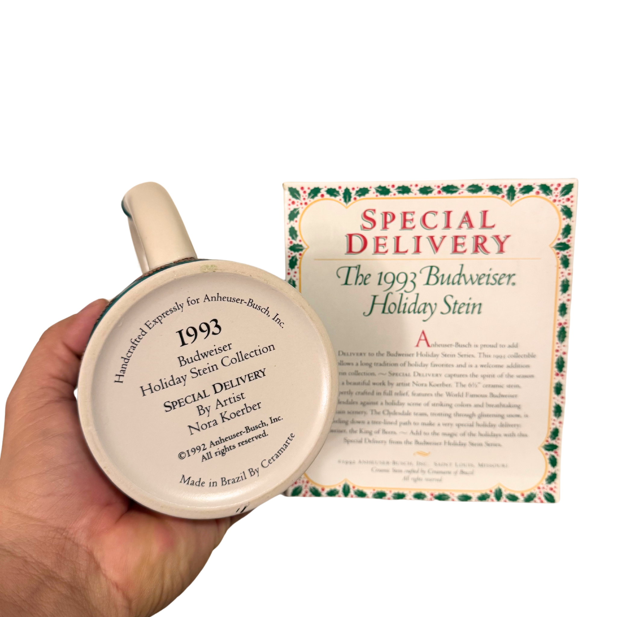 Discover the Budweiser Beer Stein mug from the Special Delivery Holiday Series, crafted in 1996. This collectible piece captures the festive spirit and showcases your holiday cheer. Don't miss the opportunity to elevate your collection with this unique stein!