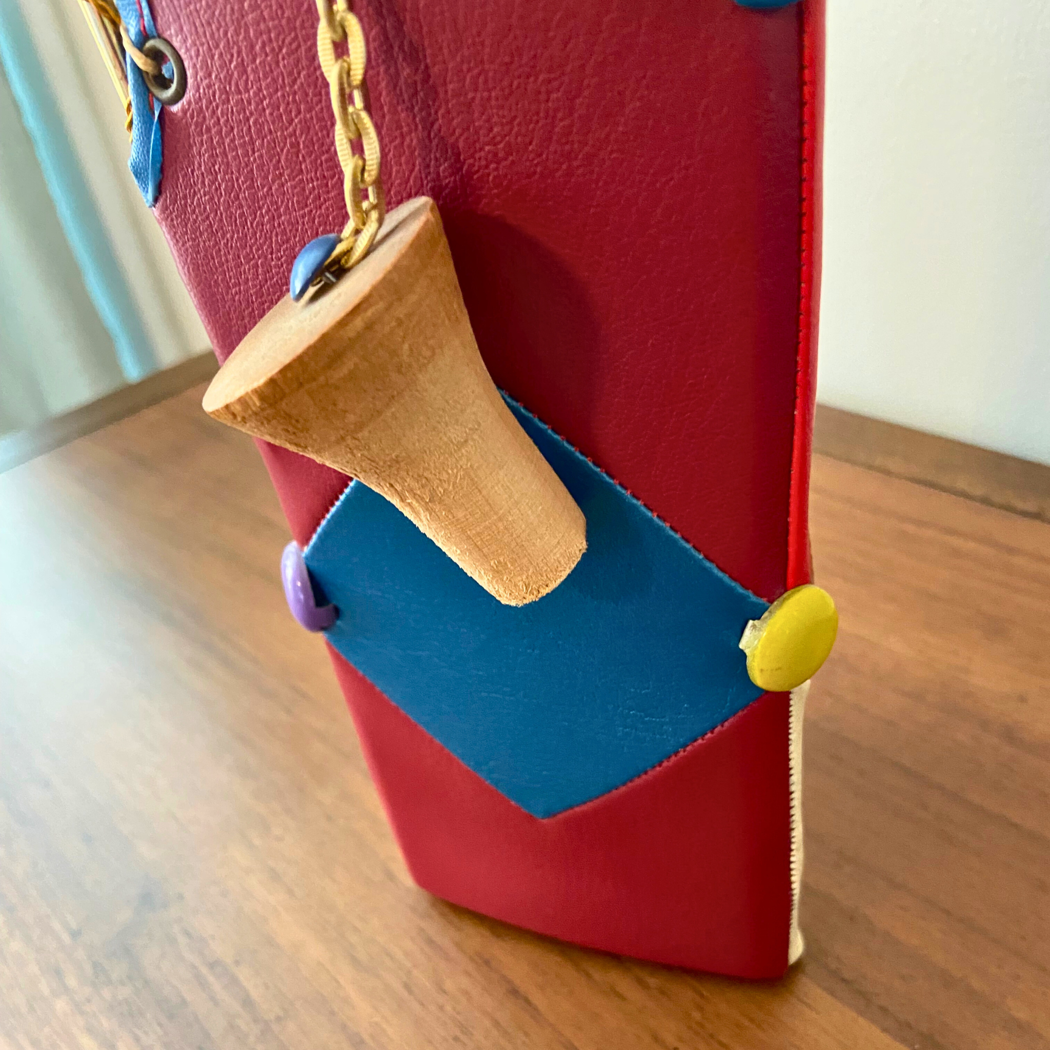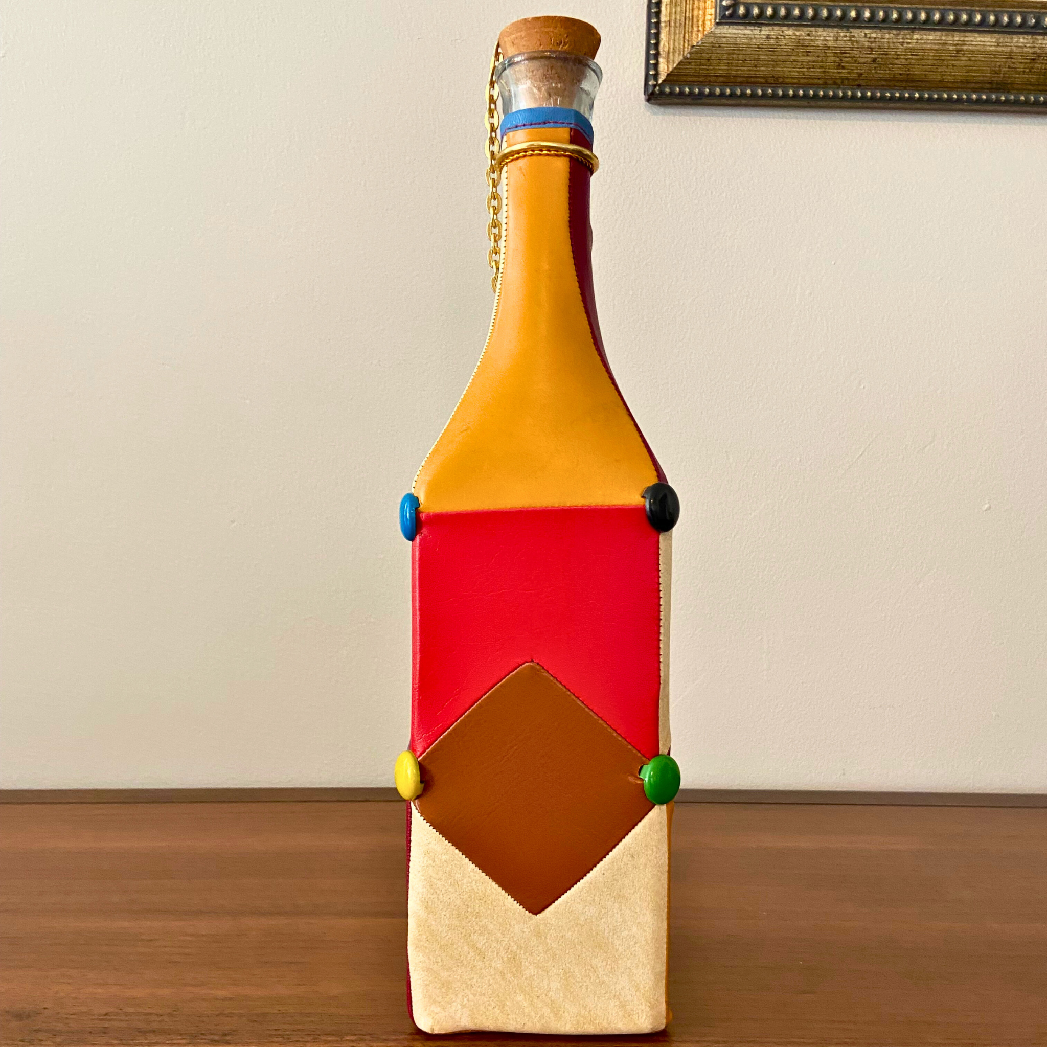 This MCM elegant vintage triangle-shaped glass wine decanter is beautifully adorned with a leather-covered finish. It includes a stylish wooden stopper and a durable metal handle, making it a perfect addition to your dining experience or a thoughtful gift for any wine enthusiast.