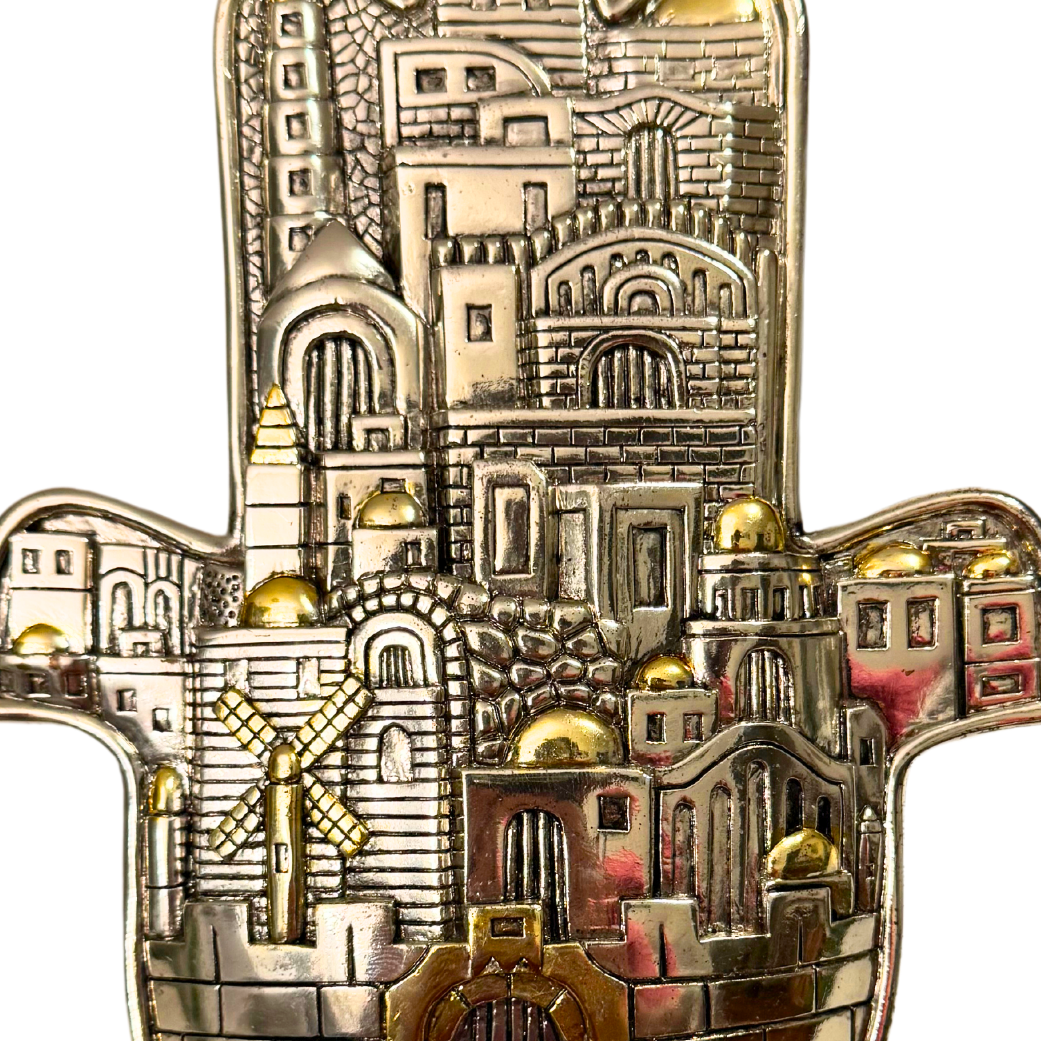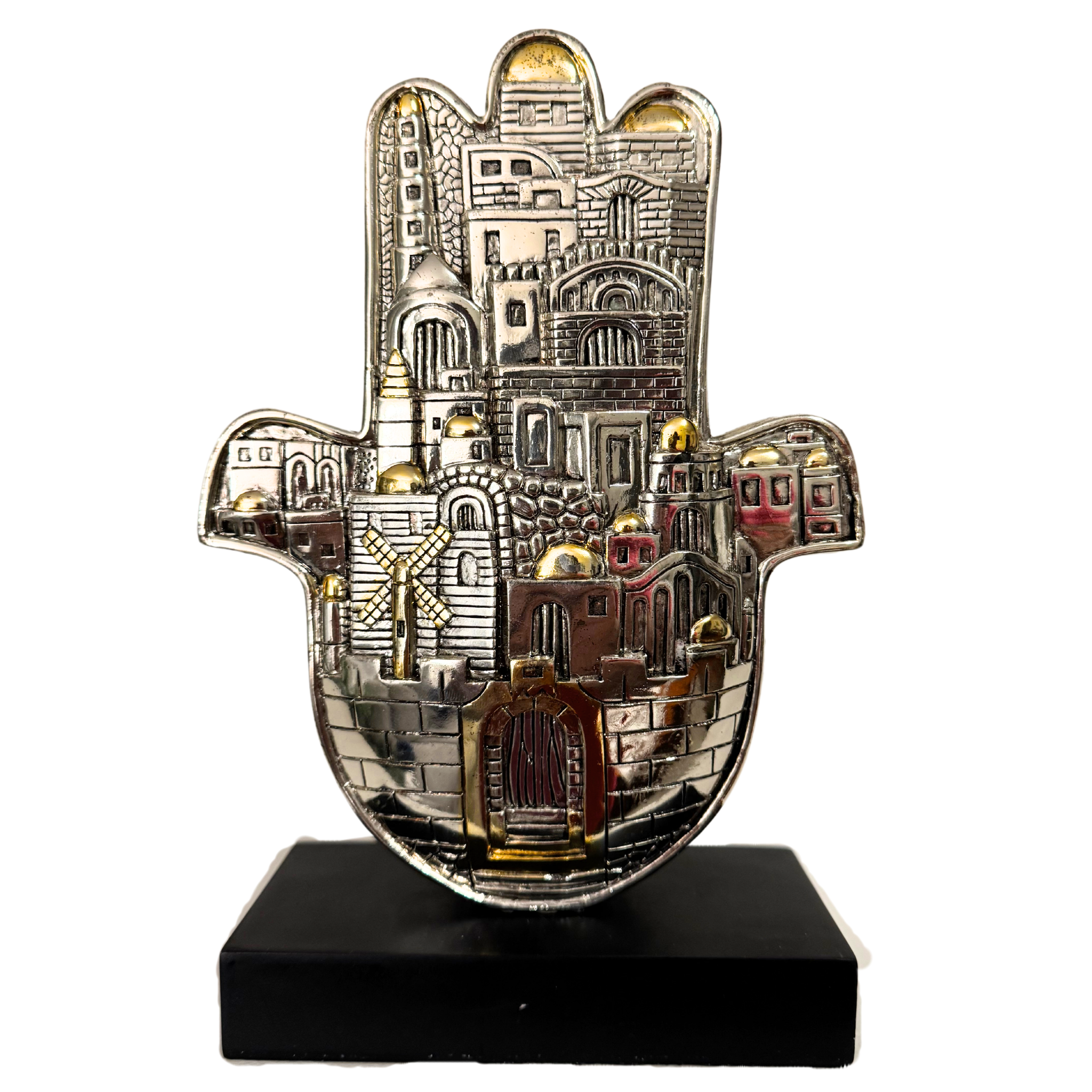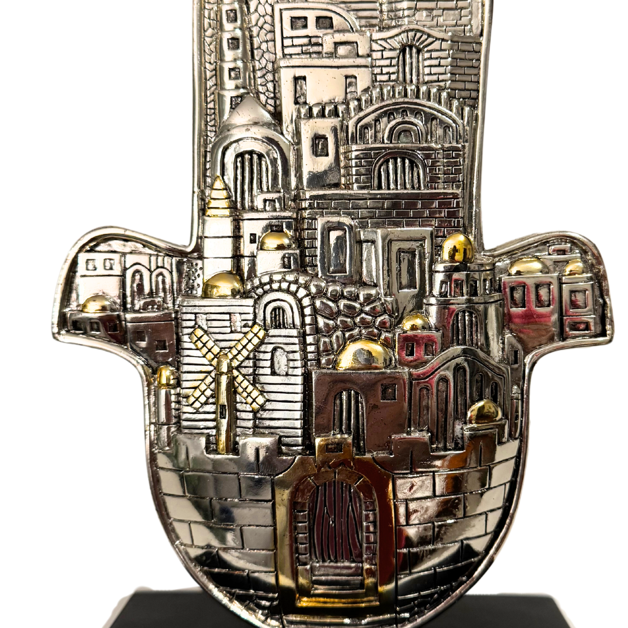 Experience the beauty of this handmade 925 silver-plated hamsa scene from Jerusalem Judaica Karshi, complete with a sturdy stand base. As a handmade item, slight imperfections are part of its charm and uniqueness (see attached photos.) This exquisite piece is proudly imported from Israel.