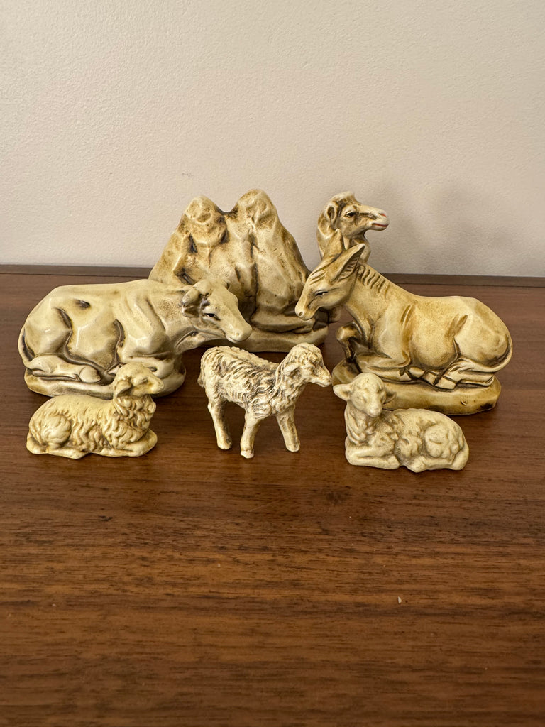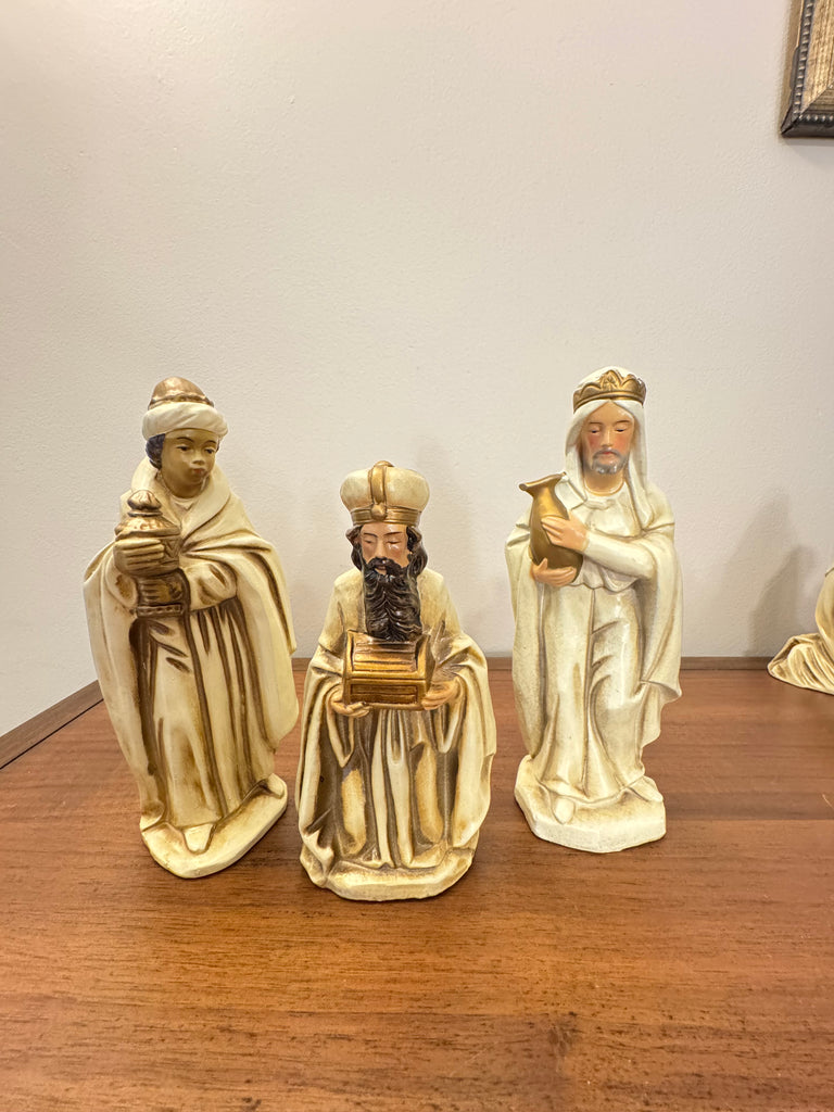 Discover a charming Vintage circa 1960s Nativity Set from Japan, crafted from exquisite papier-mâché and featuring a beautifully handmade and painted wooden manger. This unique piece will add a touch of warmth and authenticity to your holiday decor.