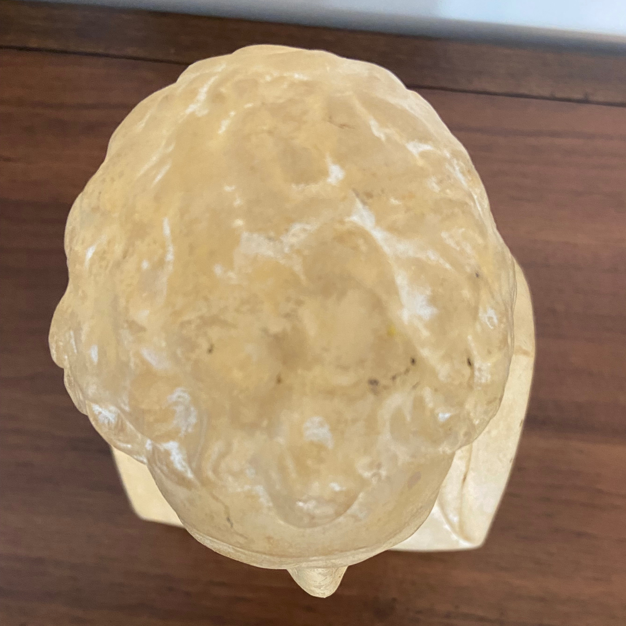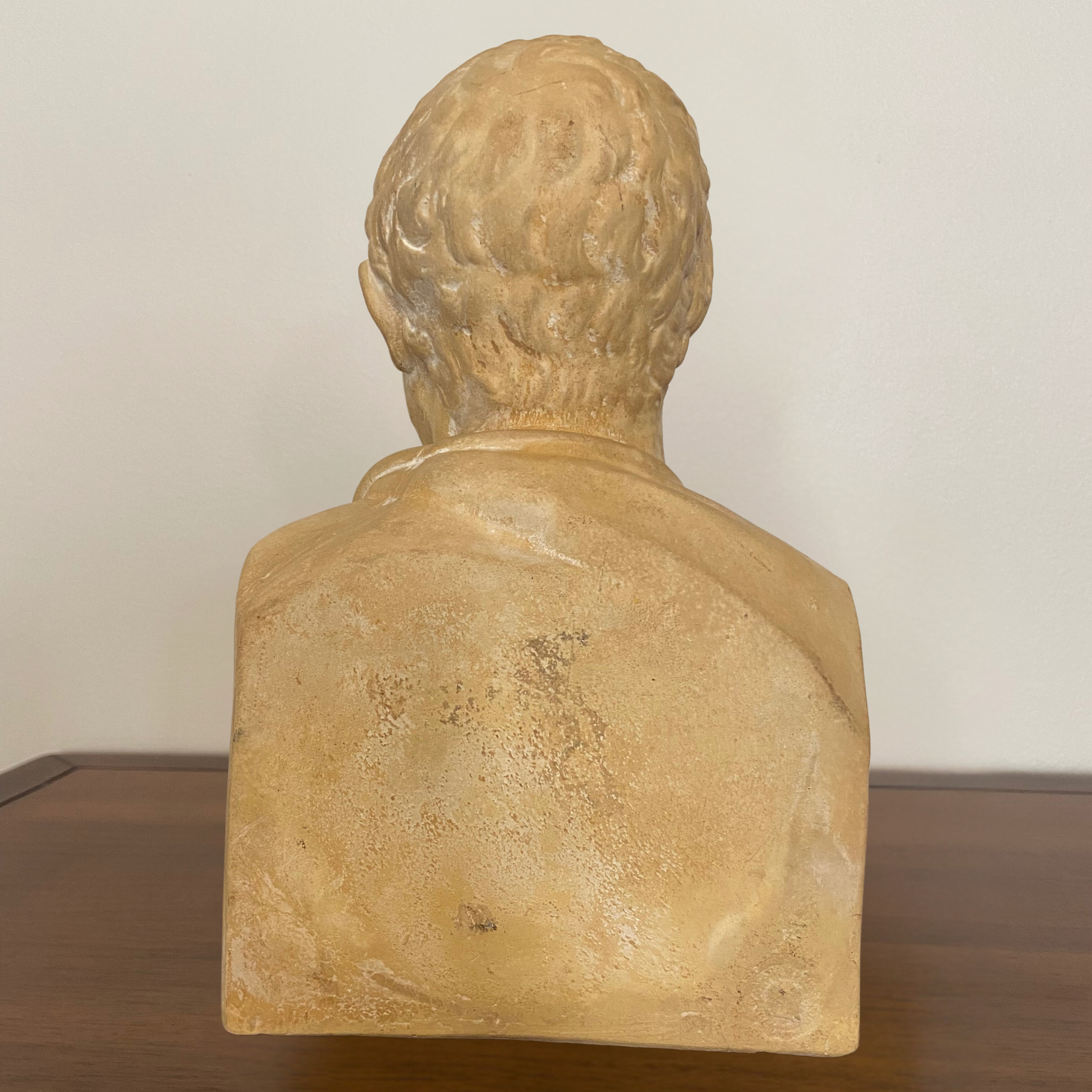 This piece is a head bust of Demosthenes, created by F. Barbedienne Fondeur. It is a cast (maybe plaster) statue featuring a stamped mark on the side shoulder.