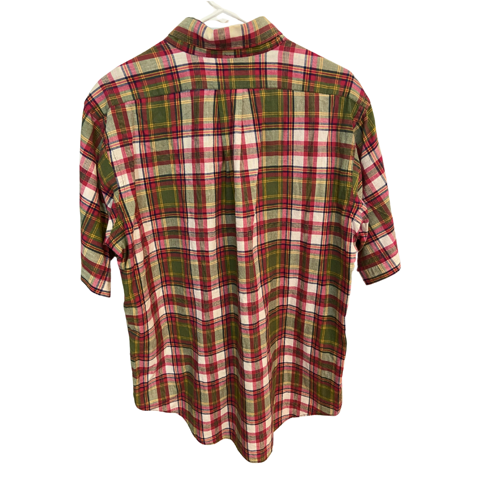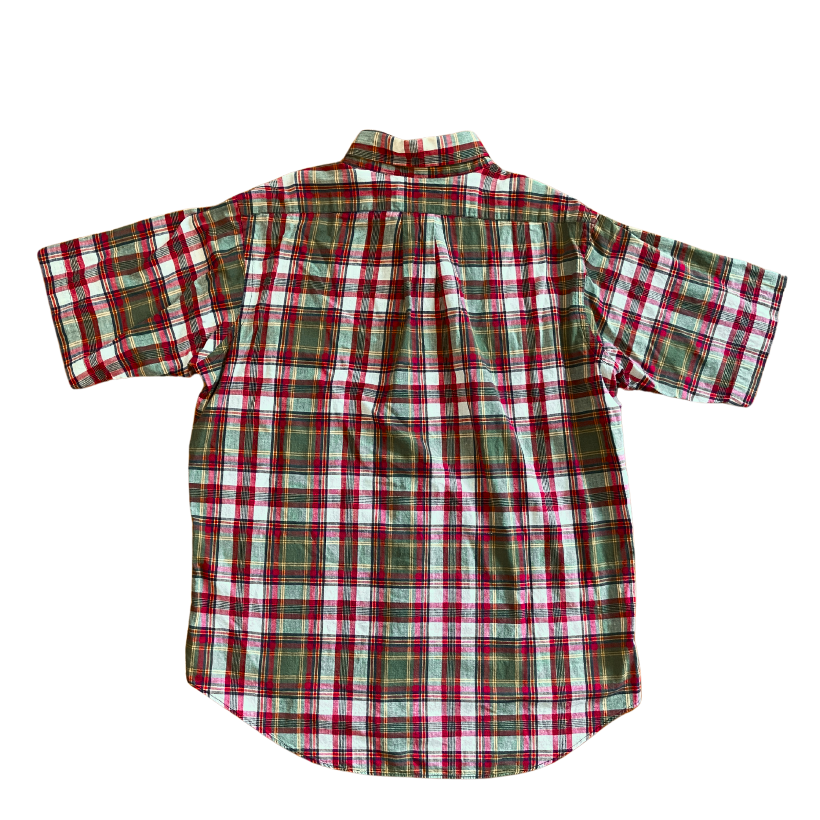 Elevate your style with this striking vintage India Madras plaid short-sleeve shirt! Boasting a vibrant multicolored plaid pattern, it features refreshing white, red, and green accents that are perfect for summertime or festive occasions. The bold fabric design adds flair and makes it suitable for casual outings and events. In good condition, this shirt offers a delightful blend of comfort and sophistication, making it a must-have for any wardrobe. Seize this opportunity to make this eye-catching piece yours today! Originally available at the esteemed House of Doherty in Worcester, Massachusetts.