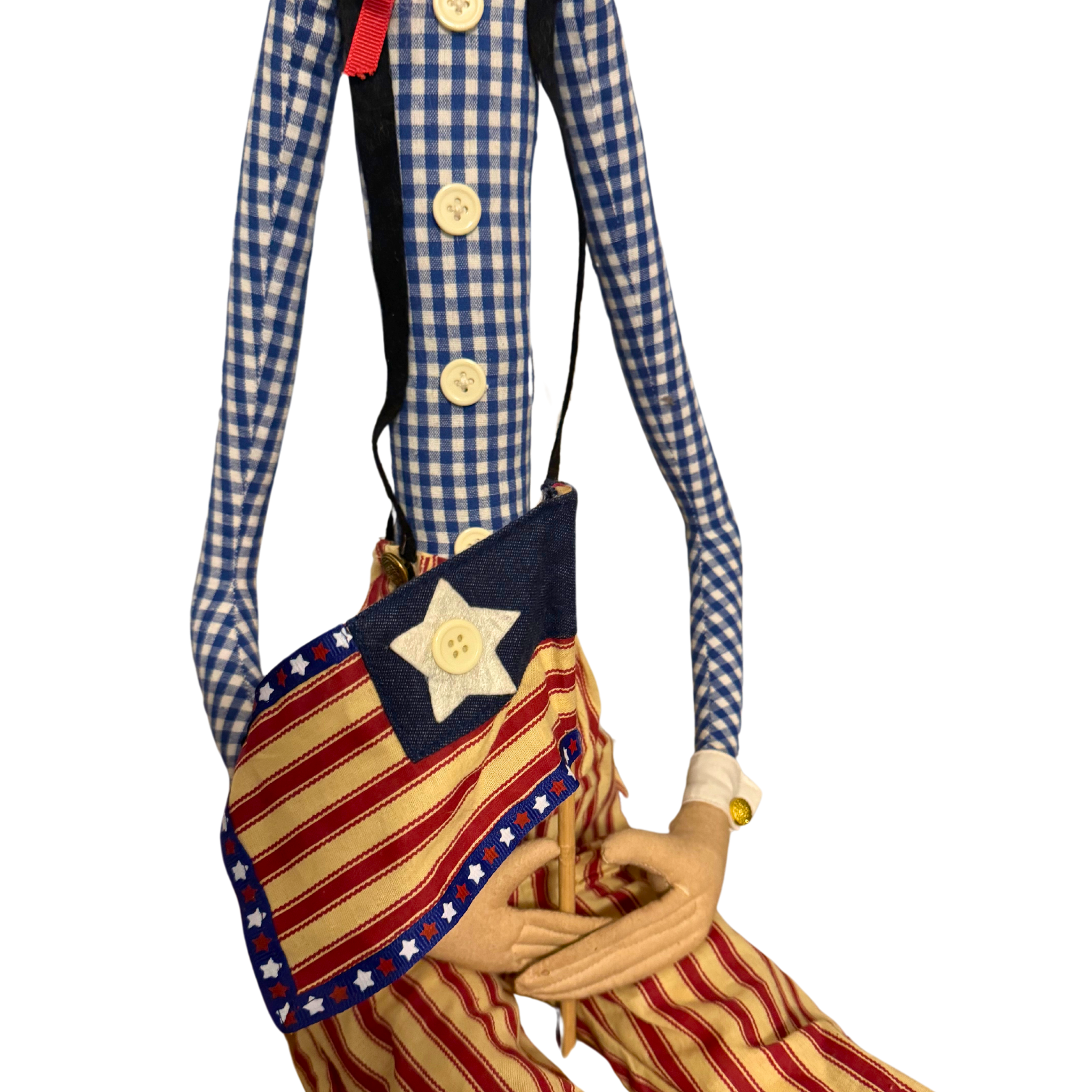A beautiful, primitive-antique Uncle Sam decoration made of fabric exudes an Americana influence and is in good condition.