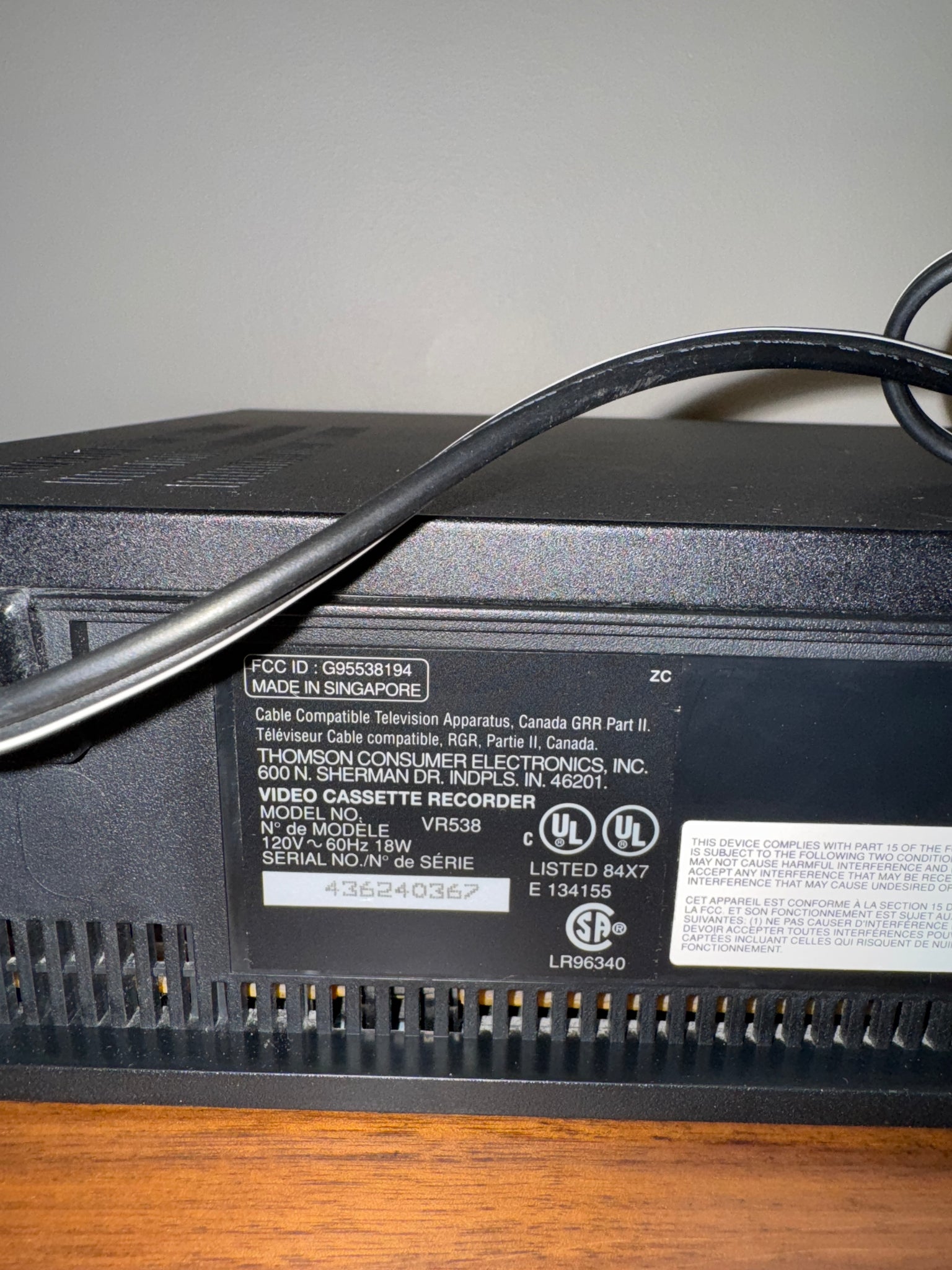 The RCA 4-Head Video System Cassette Recorder (VHS-VCR) has the serial number 436240367 and the FCC ID G95538194. It was manufactured in Singapore and is compatible with 20 Cable Television Apparatus. Additionally, it meets Canada GRIP Part I standards for cable compatibility and RGR, Part II, Canada, under Thomson Consumer Electronics Inc. The model number for the Video Cassette Recorder is VVR538. The VCR does not have a remote control.