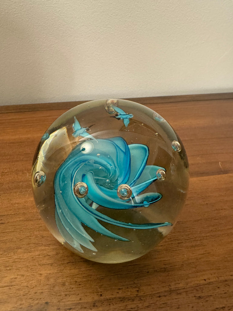 Discover the captivating beauty of this Blue Wave in a clear glass paperweight, elegantly designed with graceful seagulls. This unique piece is perfect for adding a touch of art to your space.
