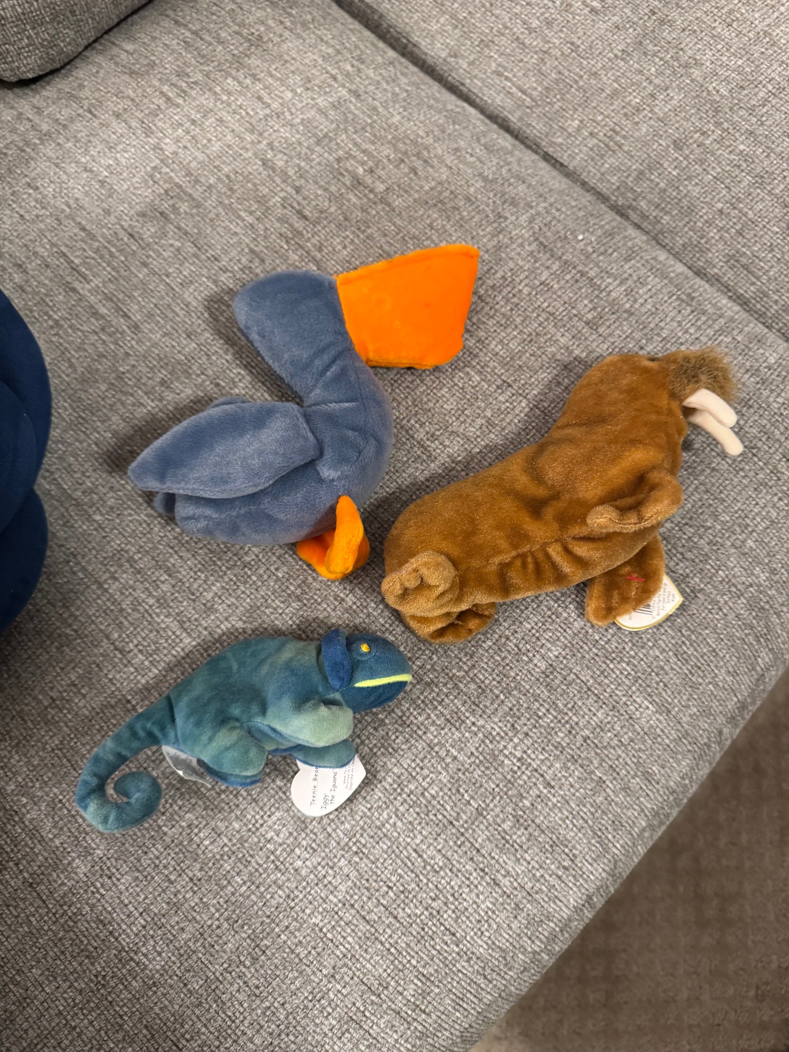 Embrace the nostalgia of these vintage 1990s TY Beanie Babies, featuring the beloved Paul the Walrus, the adventurous Scoop the Pelican, and the irresistibly cute Iggy the Iguana. Each reminds us of the joy in cherished memories.