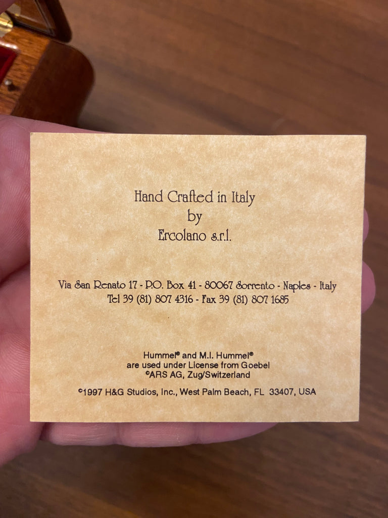 Vintage Authentic M.J Hummel Handcrafted Ercolano Italian Wooden Music Box