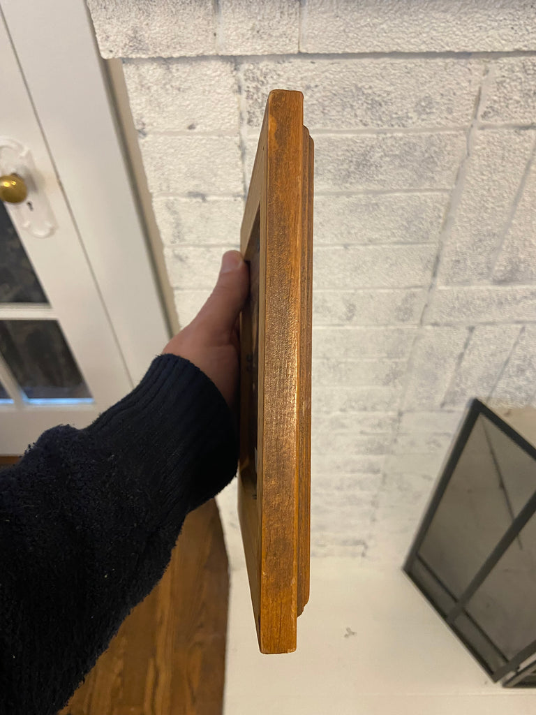 Measurements: 8 in H x 8 in W x 0.75 in D frame and the copper tile 4.1 in H x 4.1 in W, approximately